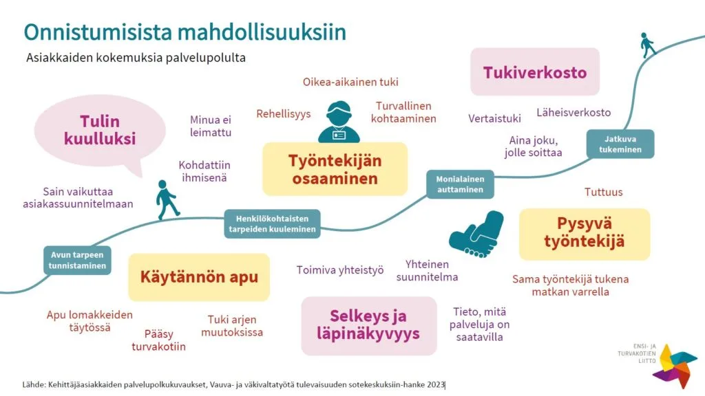 Ensi- ja turvakotien liiton sote-hankkeessa pysähdyimme syventämään ymmärrystä avun tarpeessa olevien ihmisten tarpeista. Kutsuimme talkoisiin mukaan reilut kolmekymmentä innokasta kehittäjäasiakasta ja kokemustoimijaa eri puolilta Suomea ja haastattelimme sekä kuvasimme heidän kokemuksensa ja palvelupolkunsa.