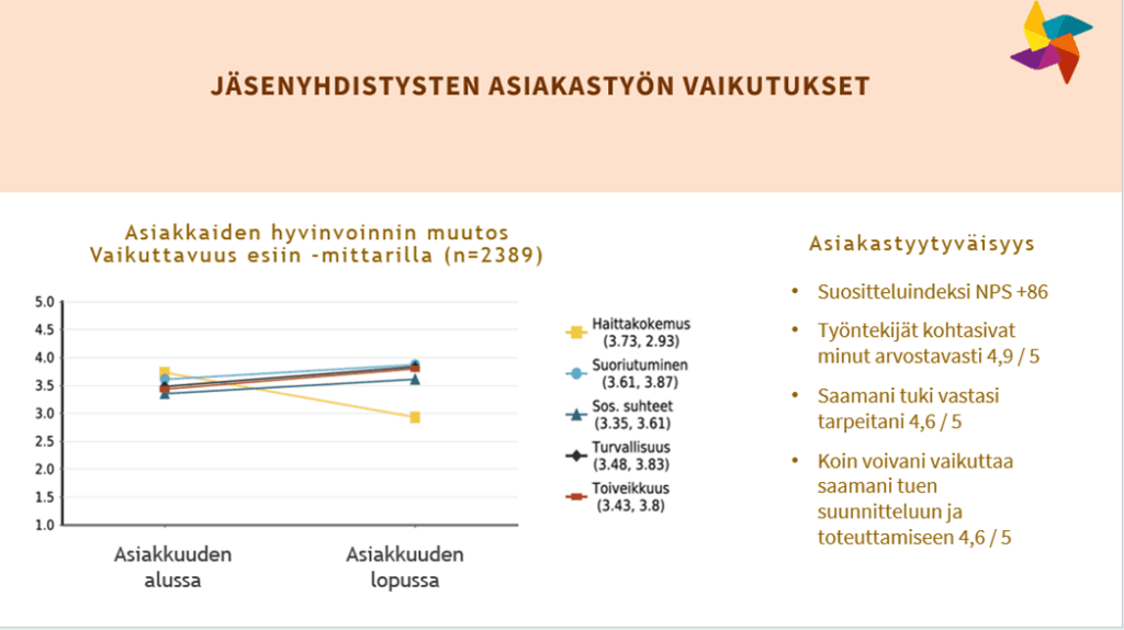 Ensi- ja turvakotien liitossa oli vuosina 2018-2022 Vaikuttavuus esiin -hanke, jossa kehitettiin jäsenyhdistysten asiakastyöhön arvioivaa toimintakulttuuria sekä VE-mittari, joka tekee näkyväksi asiakkaiden oman kokemuksen hyvinvointinsa muutoksesta asiakkuuden aikana.