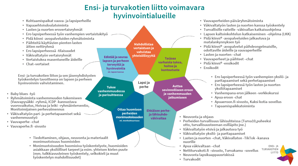 Ensi- ja turvakotien liiton ja sen jäsenyhdistykset ovat korvaamaton voimavara hyvinvointialueilla. Tähtikuvio kuvaa millaista apua yhdistykset tarjoavat lapsille ja perheille hyvinvointialueilla.