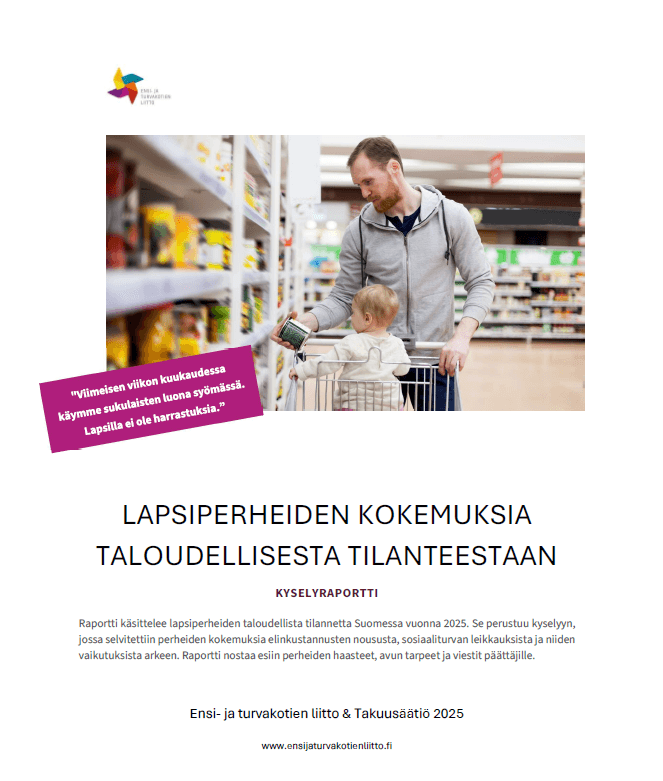 Raportti käsittelee lapsiperheiden taloudellista tilannetta Suomessa vuonna 2025. Se perustuu kyselyyn, jossa selvitettiin perheiden kokemuksia elinkustannusten noususta, sosiaaliturvan leikkauksista ja niiden vaikutuksista arkeen. Raportti nostaa esiin perheiden haasteet, avun tarpeet ja viestit päättäjille.