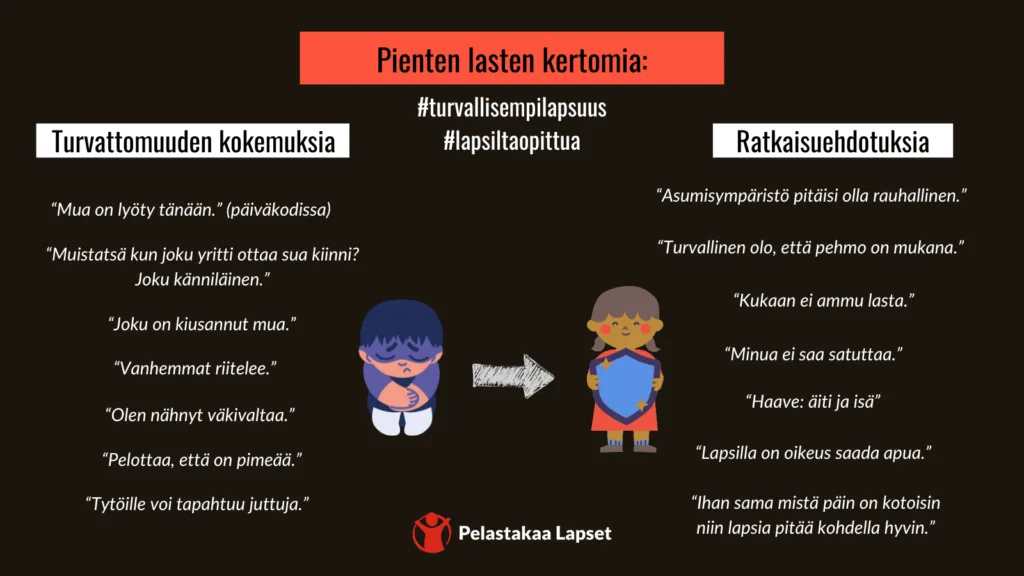 Lapset kokevat ja näkevät turvattomuutta ja väkivaltaa niin kotonaan, lähiympäristöissään kuin ystäväpiirissään. Lasten turvallisuuden kokemusta heikentävät mm. perheiden vaikeat elämäntilanteet (ero, perheväkivalta, pakolaisuus) tai yhteisöjen turvattomuus (yhteiskunnalliset kriisit, lasten vertaisväkivalta). Myös lapsiperheköyhyys lisää turvattomuutta.
