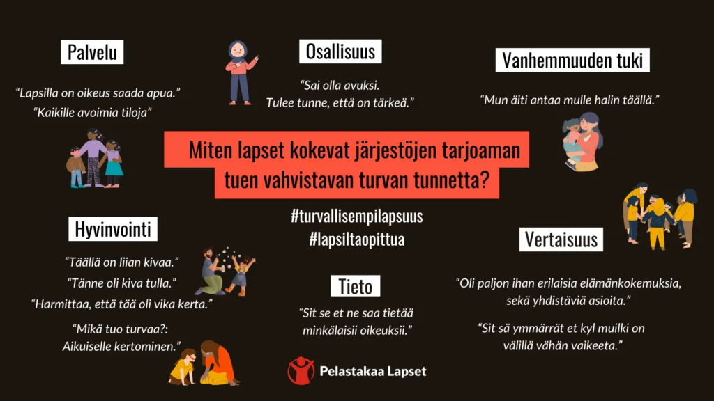 sekä yhteisvaikutusten arviointi ennen päätösten toimeenpanoa. - Lasten kokemuksia ja mielipiteitä on kuultava päätöksenteossa. Lasten mielestä turvallisuutta luovat rauhallinen elinympäristö, mahdollisuus saada apua, turvallisten aikuisten läsnäolo ja kaikkien tasa-arvoinen kohtelu. Lapset kertovat järjestöjen toimintojen antaneen merkittäviä turvan ja yhteenkuuluvuuden kokemuksia. Kokemus osallisuudesta lisää tutkitusti lasten turvallisuuden tunnetta ja hyvinvointia.