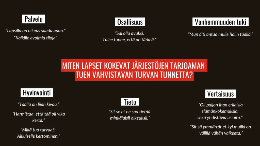 Seuraava kuva kertoo, kuinka järjestöjen toiminta tukee lasten turvan tunnetta lasten itsensä kertomana.